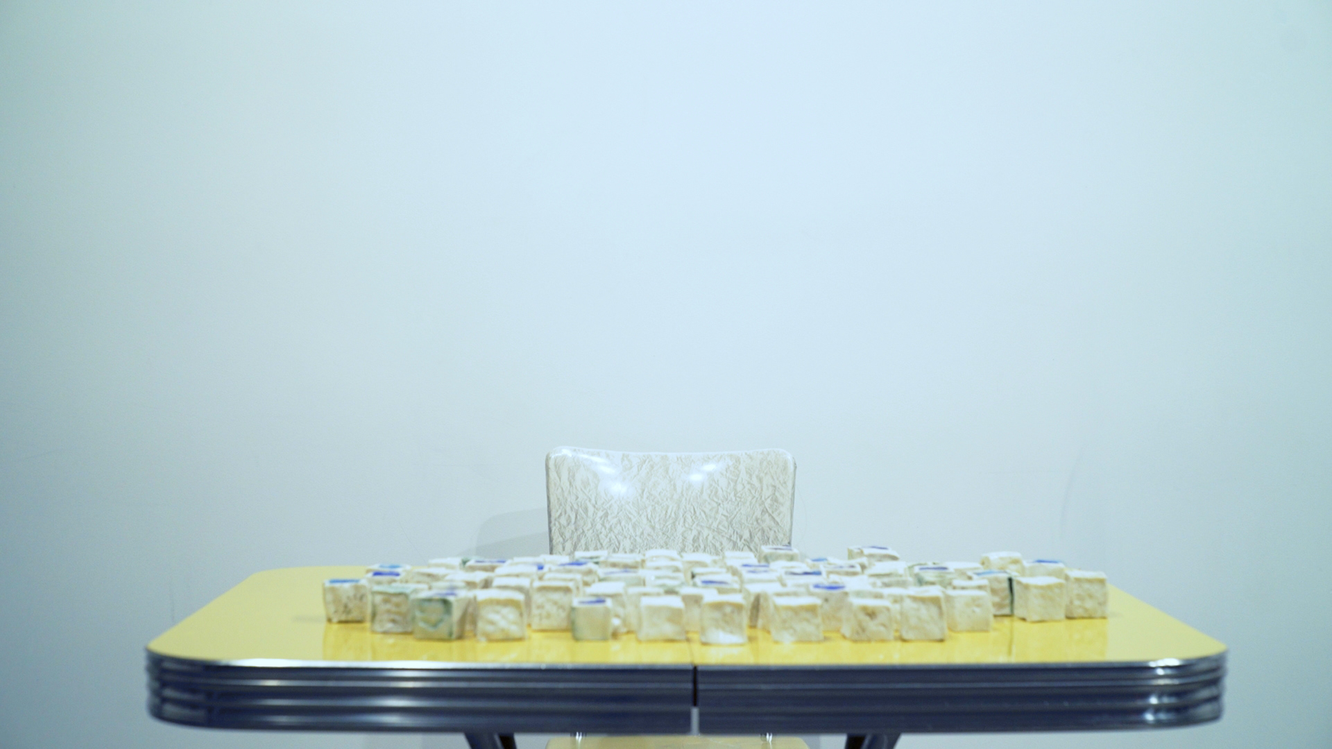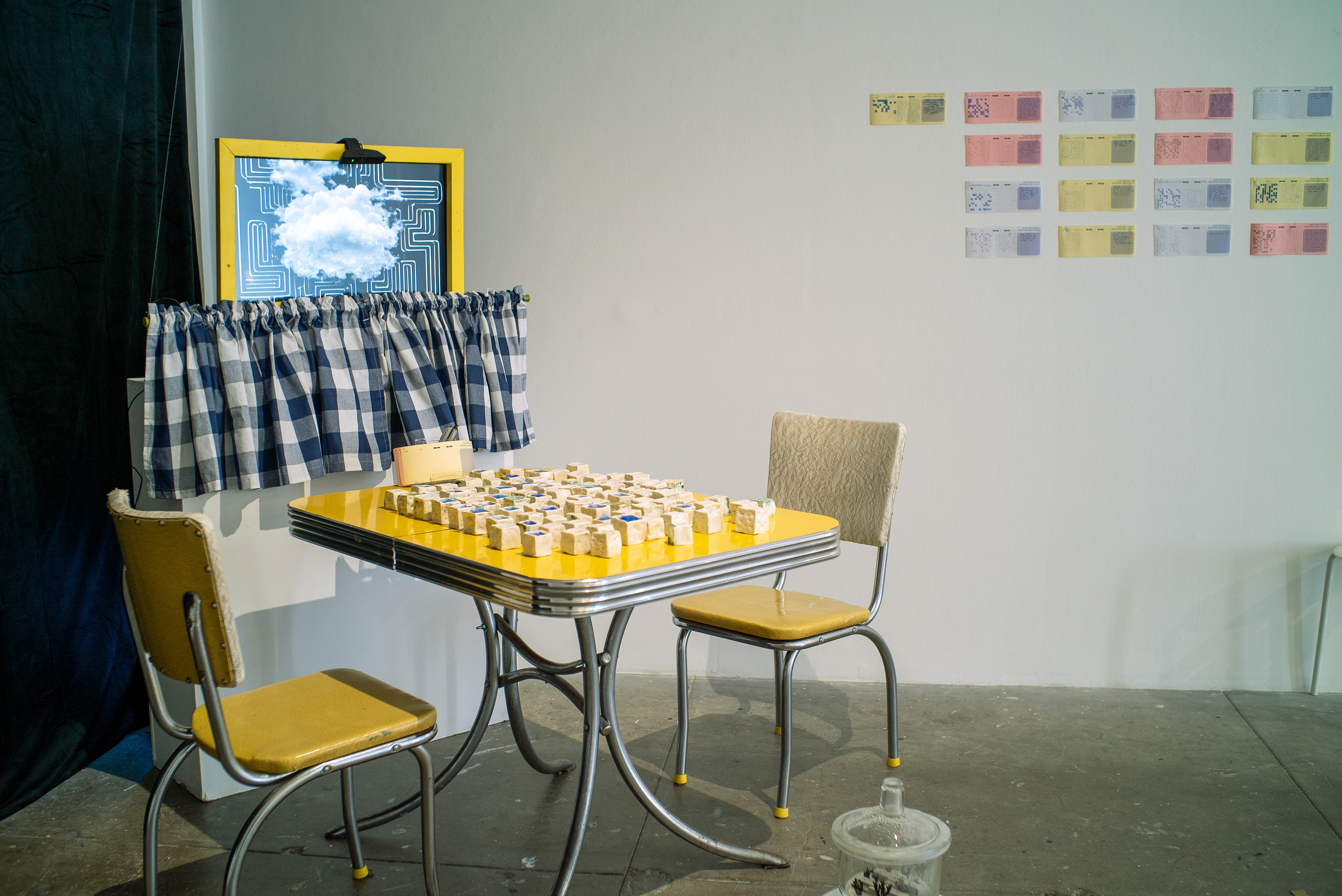 Teach The Machine Something About Cloud (2024) is a multimedia installation first installed at SOIL Artist Run Gallery in Seattle, Washington. Upon entering, viewers encounter a scene. A vintage looking yellow dining table with shiny aluminum detailing paired with two matching chairs on both sides. On the surface of the table are nearly one-hundred ceramic cubes of one-inch size. The cubes each has five walls, and is filled with heavenly soft blue silk fibers, like fog. Behind the table, a suspended yellow window frame frames a generative cloud animation. A webcam sits on top of the window. Its green LED light on, indicating that the mechanical eye is watching.
