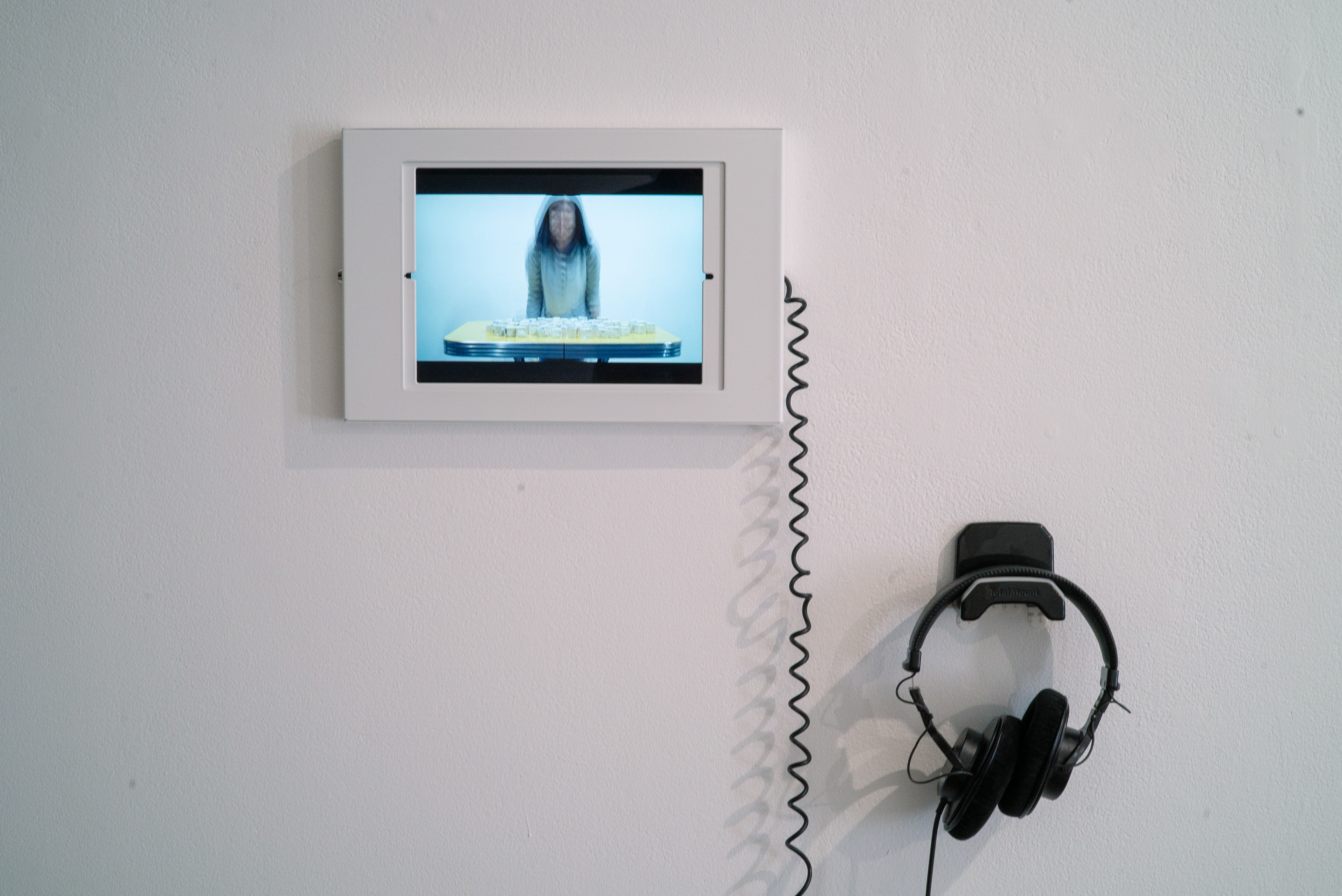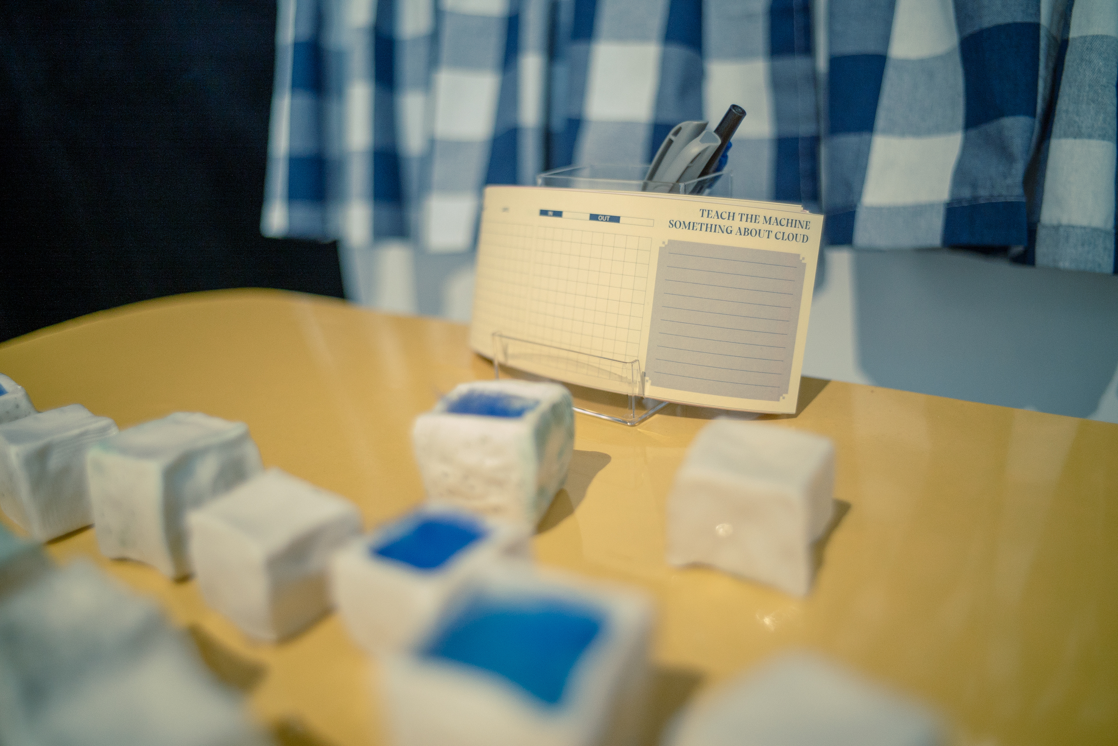 How to make sense of this scene, then? Viewers will find a tablet kiosk on the wall on which a corporate-style onboarding video is looped. The video outlines four steps which an individual can take to "Teach the Machine Something About Cloud". Step one, generate random patterns. Viewers will randomly pick up two ceramic cubes from the table and compare their weights. The one lighter in weight will be flipped upside down, hiding or revealing the blue silk fibers inside. Viewers will repeat this 10 times to generate a random pattern on the table. Step two, fill the grid. Viewers will observe the generated pattern and try to fill out a 9x10 grid on paper accordingly. Step three, data prep. Viewers will translate the grid from previous step into machine readable binary codes - 0 and 1. Step four, data entry. Viewers are asked to think of a cloud lesson to teach the machine, and pair up the handwritten natural language with the binary code they just generated. After completing the four steps, they have now voluntarily produced data and contributed to an absurd dataset -- one that means nothing but carries the affect of becoming anything and everything.